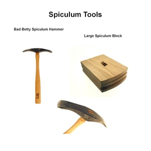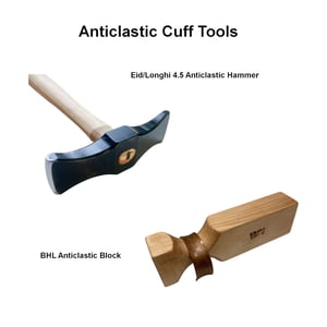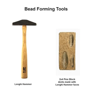 A selection of tools made by NC Black for Betty Helen Longhi's workshops. One hammer and block for spiculums, one hammer and block for anticlastic cuffs, and two hammers and a block for synclastic forming. One of the synclastic hammers is used in the bead making exercise in "Creative Metal Forming" and the other is for general synclastic forms.